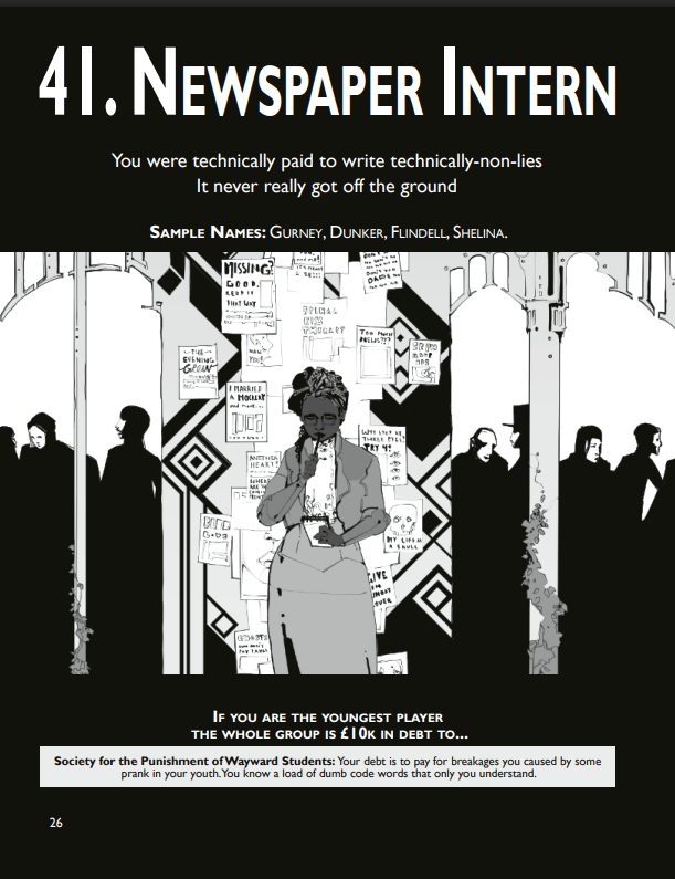 While Into the Odd may be the mechanical system for Electric Bastionland, I would argue that the main game exists almost completely in these failed careers. They cram so much information into a few paragraphs, a couple of tables, and a beautiful piece of art.