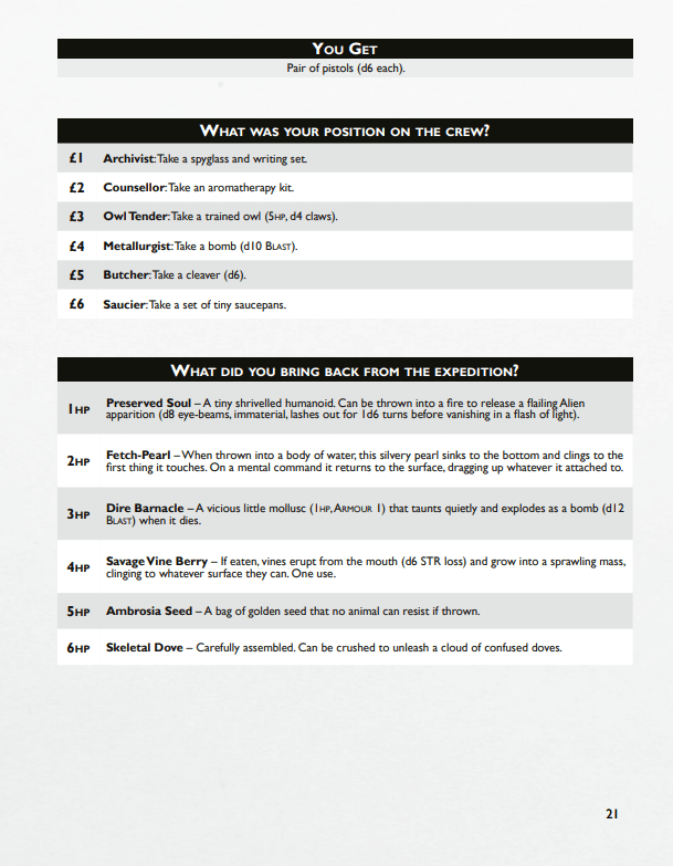 This game blew my mind when I opened it for the first time. The failed careers make up a majority of the game both metaphorically, but also physically. There are about 15 pages of game rules then 200 pages of failed careers. Two. Hundred. Each one has the same format, the beautiful art shown above, and then the associated tables, shown below.